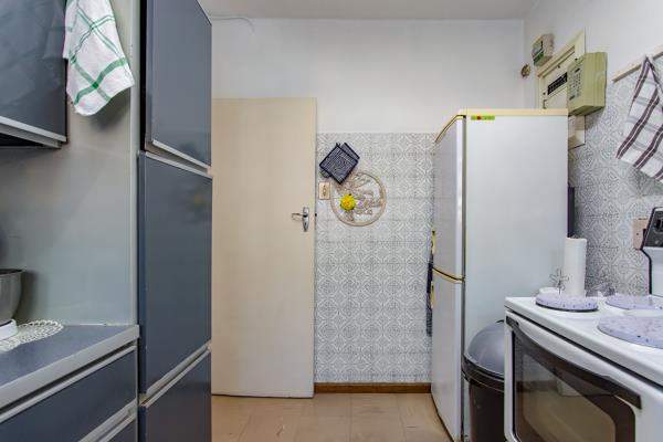 The kitchen is fitted with built-in cupboards and provides space for both a stove and washing machine.