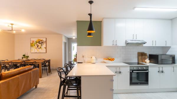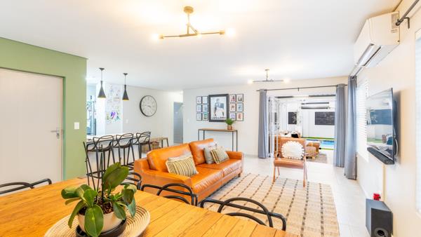 Spacious Open-Plan Living:** The expansive living area flows seamlessly from the entrance, offering an inviting space for family gatherings and entertaining guests. Large stacking doors with shutters open out to the under roof braai area, creating an indoor-outdoor entertainment hub.