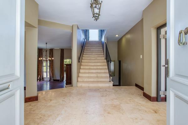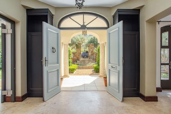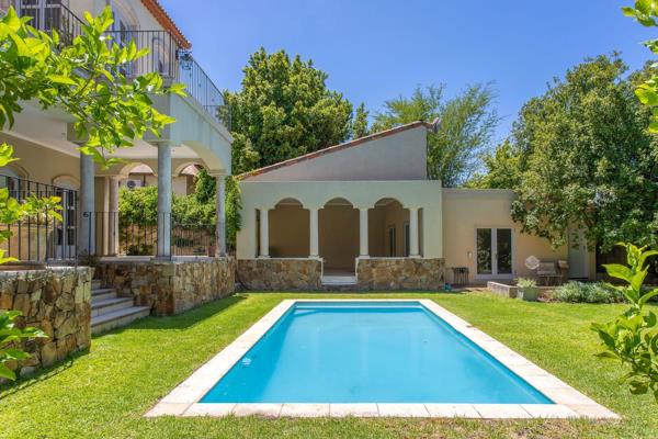 As you enter the courtyard, you are welcomed through the double doors of the entrance hall. Immediately captivated by the French-inspired charm of this beautiful beloved family home. The sophisticated, charming and hidden gem is more than just a home, it offers a unique lifestyle. The open plan dining and spacious living areas with luxurious French chandeliers and cozy Provencal fireplace flow out onto the sheltered veranda with a built-in braai, leading to the kitchen on the right with a Euro Gas stove, fireplace, pantry, scullery, wine cellar and guest toilet. A spacious entertainment area with privacy in a perfect setting, ideal for year-round entertainment. Hosting family and friends overlooking and enjoying the sparkling pool and landscaped garden. The upstairs comprises of four spacious en-suite bedrooms sharing a pajama lounge and a custom-build study on the upper level, allowing for the serene work-from-home space. The generously sized master bedroom with a walk in dressing room opens through French doors onto a Juliet balcony overlooking the exquisite mountain views. The staircase, travertine tiled and screeded floors has central heating throughout the house. In addition to the main house the original double garage, converted into an extra outdoor entertaining area, completes this excellent opportunity with endless potential.