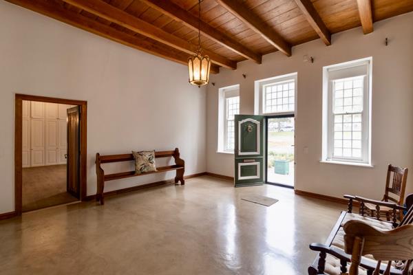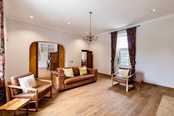 The residence features an expansive entrance hall with high ceilings leading to a dining room that opens onto a private patio with a braai area. The lounge and family room have doors to the back stoep, which overlooks the swimming pool. The spacious farm-style kitchen includes a gas hob island and an eye-level oven.