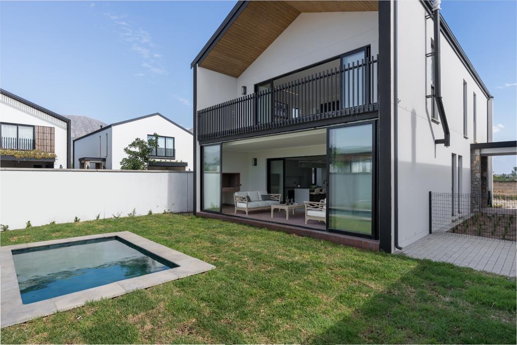 Set in the most picturesque area of the Cape Winelands, Drakenzicht Estate exhibits a refined design and top notch security features. This modern home covers an area of 280 square meters and includes three bedrooms with three and a half bathrooms, epitomizing luxury through its elegant aesthetics, generous layout, and seamless integration of indoor and outdoor living spaces.
