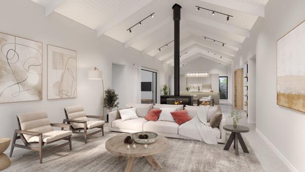 With exposed beam ceilings in the main living area and generous double glazed windows, the interiors feel bright, airy, and contemporary. Stackable glass doors open from the living space into an enclosed braai room, extending naturally to the patio and garden, making it the perfect setting for year round indooroutdoor living.