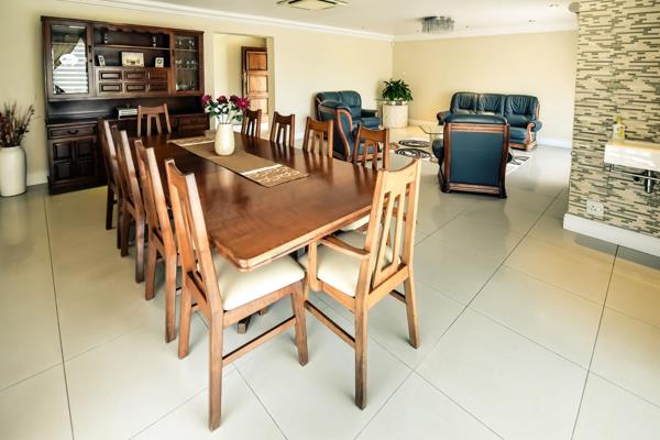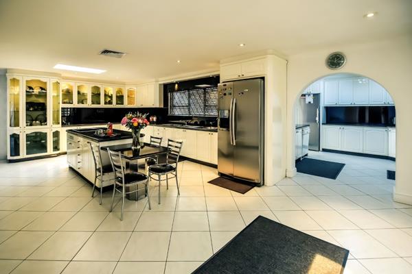 The kitchen is the highlight of this property, featuring two skylights for natural light and is finished with solid wood and has white gloss built-in cupboards with glass display cabinets. The kitchen tops are finished in granite and hosts a granite table with 14 steel chairs finished in chrome, complimenting the kitchen.