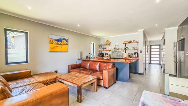 The open-plan kitchen, dining, and living areas flow seamlessly onto a covered patio with a built-in braai perfect for entertaining. The generous garden, complete with a 1 000L JoJo tank, provides ample space for both play and gardening enthusiasts and is pet friendly. A stylish guest bathroom is cleverly positioned beneath the staircase for convenience.