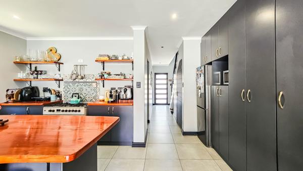At the heart of the home lies a sleek, modern kitchen featuring ample cupboard and shelving space, ideal for those who enjoy entertaining.