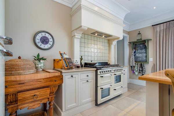 The gourmet kitchen is a focal point of the home, designed to be a central gathering space for family and guests around the island. Adjacent to the kitchen is an intimate outdoor patio with a built-in braai. The separate scullery and laundry area ensure convenience and ease of use.