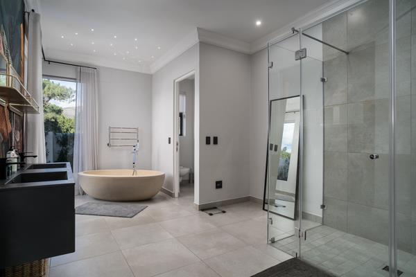 This beautiful home offers 4 well sized bedrooms all with ensuites, a large audio visual room, a study, a guest cloakroom, spacious open plan living areas and kitchen, utility room, triple garage, staff accommodation, invertor system, solar geyser and a well established garden.