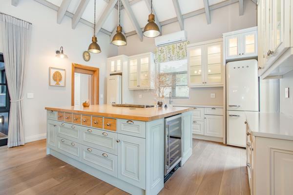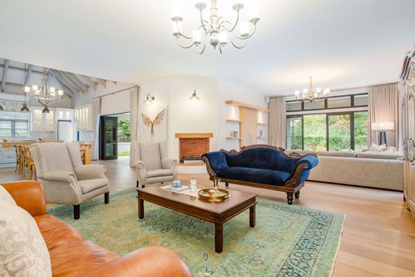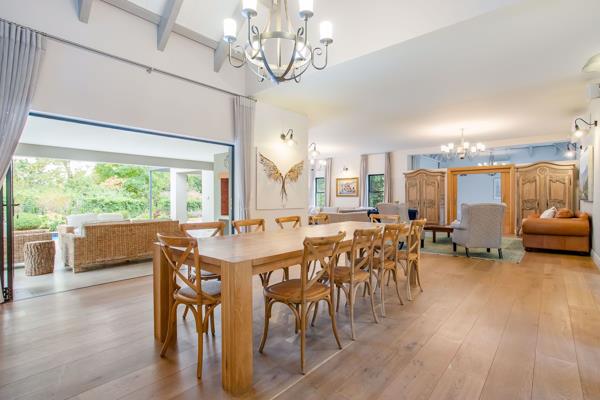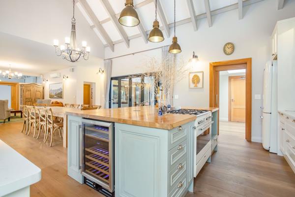 Exquisite. Joint Mandate. This is an exquisite house situated in a highly sought after area of Pearl Valley and designed by Johan Malherbe. It is absolutely stunning with Zimbo''s oak flooring, and beautiful wooden doors and doorways. High ceilings and exposed beams give it a country farmhouse feel while the design, detail and top quality finishes envelop you in luxury and sophistication. From the entrance hall is a guest cloakroom to the right, and a spacious office to the left which has direct access to the garages and stacking doors to the atrium. The gorgeous kitchen is elegant and practical with a large central, wooden topped island, and a scullery and a laundry leading off it into the garage and outside to the laundry courtyard. Kitchen and dining room are open plan and double volume with exposed trusses and open on both sides to the atrium, and to the undercover braai patio. The generous living room has a gas fireplace and doors onto the garden. Off the living room is a separate room which could be another TV room, playroom or study, and opens through French doors to the garden.