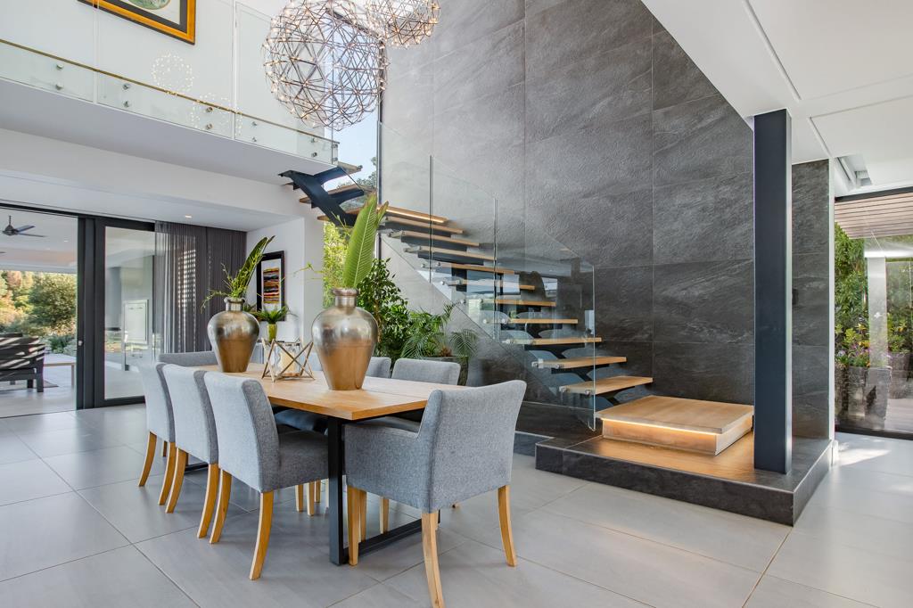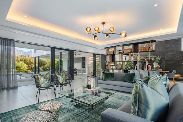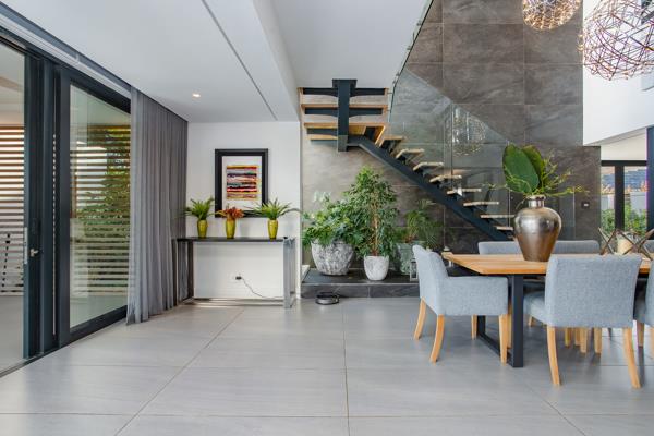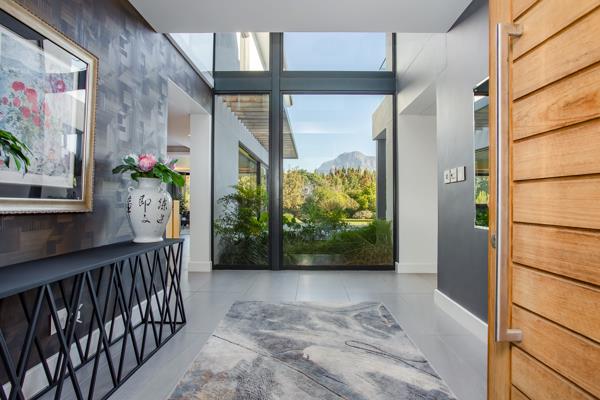 As you enter through the front gate, you''ll be greeted by a beautifully crafted Japanese garden leading to a robust walnut front door, setting the stage for what lies ahead. The grand double-volume entrance hall offers a glimpse of the mountains, while the open-plan dining area and formal lounge seamlessly connect to the teak deck and a stunning 9-meter rimflow swimming pool, complete with a covered braai patio. Here, you can relax and take in the serene beauty of the Simonsberg and the tranquil surroundings of the garden.