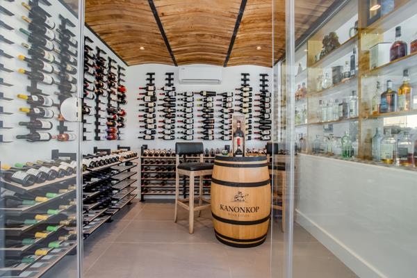 To the left of the foyer, the fifth en suite bedroom also serves excellently as a study and opens directly into the Japanese garden. Adjacent to this is a remarkable climate-controlled wine room, framed in glass and adorned with a distinctive brandy barrel stave ceiling.