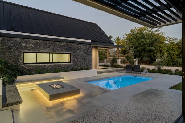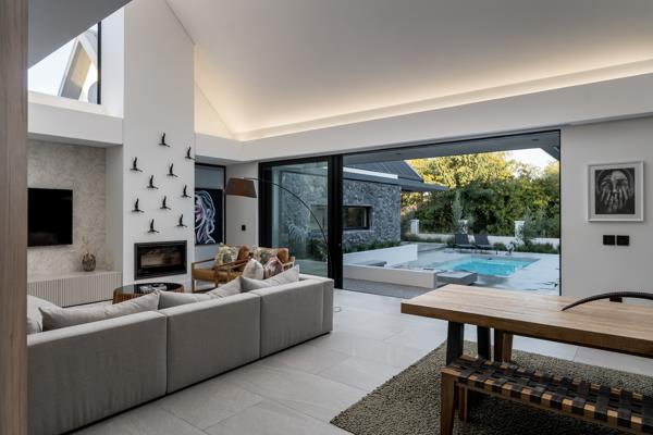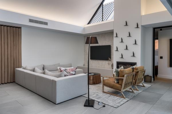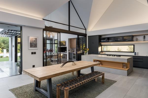 Featuring a built-in fireplace for cozy winter evenings. Adjacent, a spacious braai room boasts a granite dining table and is illuminated by a Stephen Pikus light fixture, setting the stage for memorable gatherings.