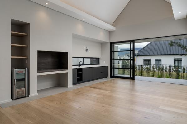 Elegant and functional, the home features spacious double-volume living areas with a high-end Blum kitchen central to the lounge , dining and entertainment spaces. The entertainment room, complete with an indoor braai, as well as the lounge area, have easy sliding glass doors opening these areas to a sunny patio, a covered patio and a pool perfect for relaxing or hosting.