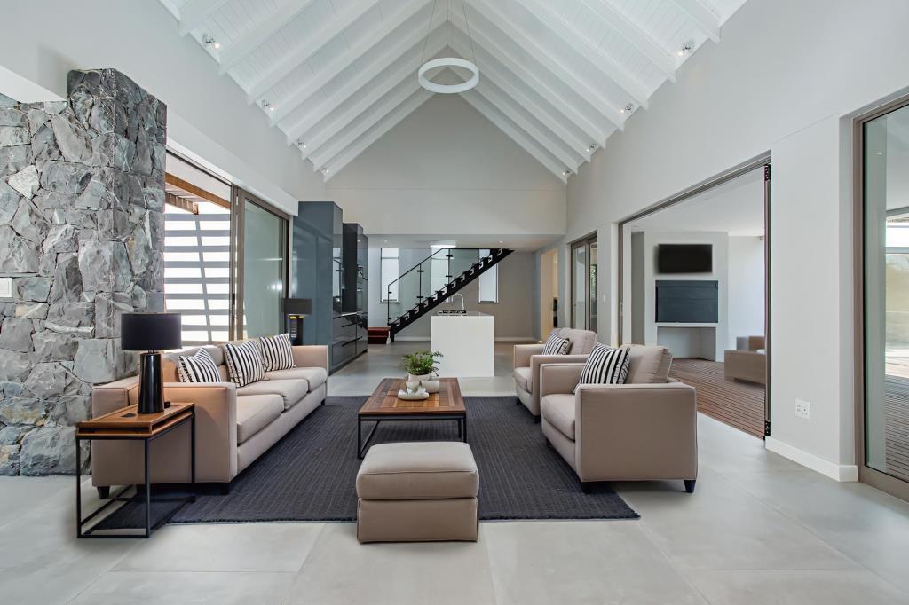 On entering the home you a met with a spacious entrance foyer leading into large double volume open plan living space consisting of the dining area with centre atrium and kitchen with a large island and separate scullery.