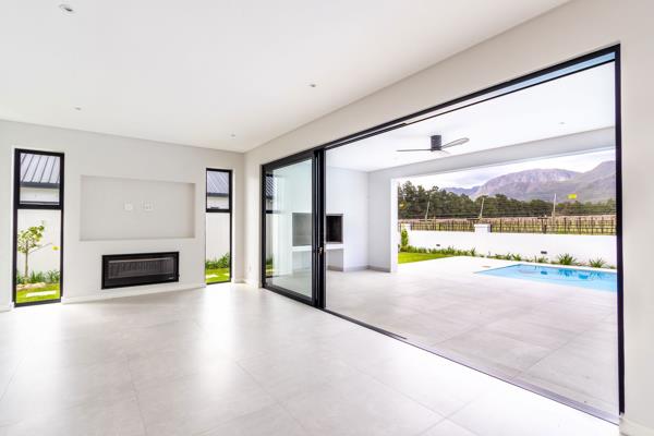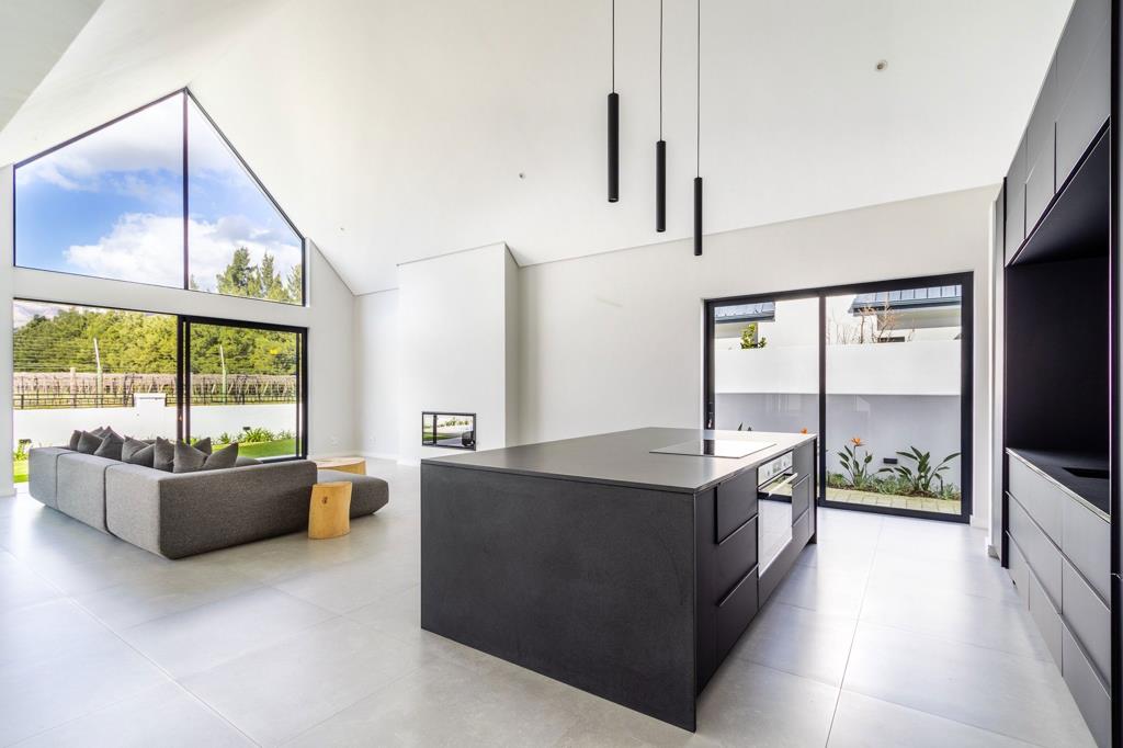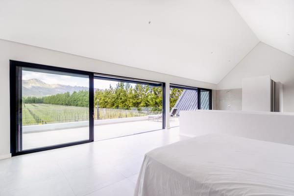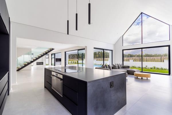 Vineyard & Mountain Views in Val de Vies River Farm. With sweeping views of the Simonsberg mountains and surrounding vineyards, this brand-new River Farm home combines light-filled living with timeless design in South Africas premier lifestyle estate.