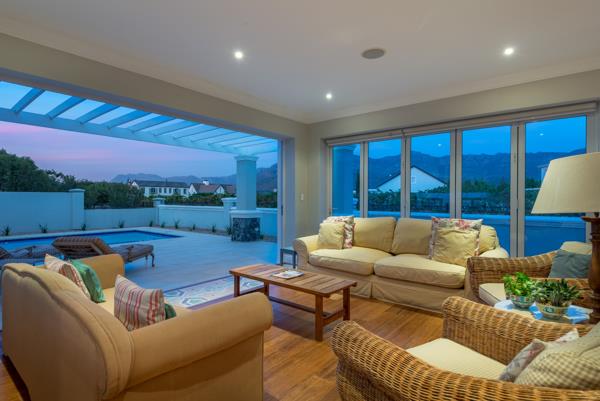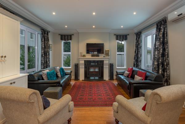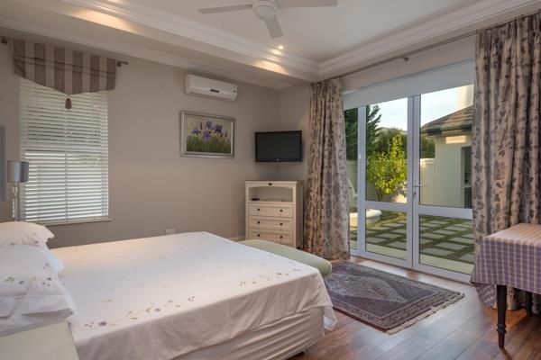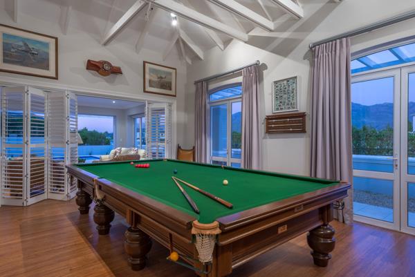 The house overlooks Val de Vies impressive polo field making for lots of excitement on Sunday mornings during the polo matches. Much thought went into the design of this home, evidenced by features such as the quaint braai gazebo, Italian style courtyard garden with fountain, and strategically placed windows maximizing views whilst retaining privacy. This grand home has classical finishes with wooden floors and beautiful cabinetry throughout.