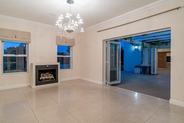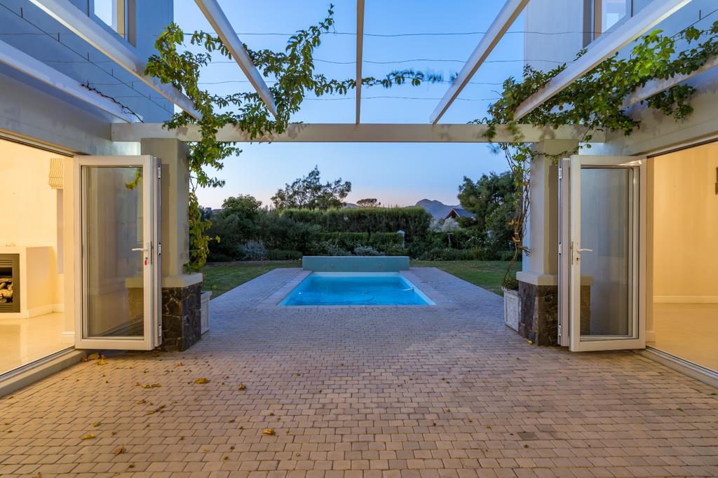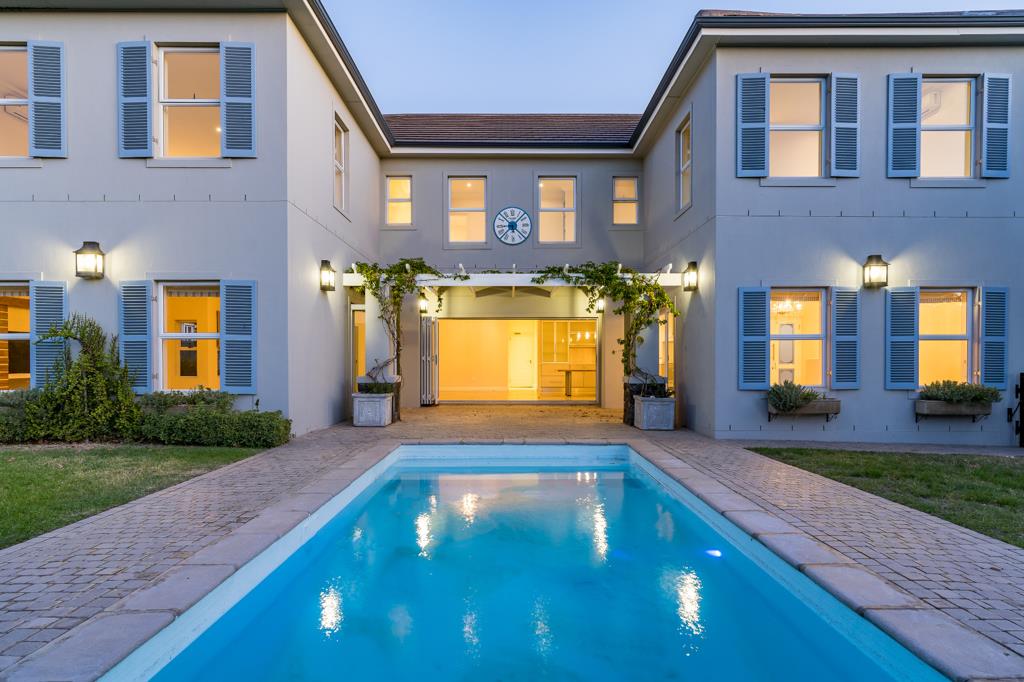 This five-bedroom home is nestled into a quiet street in Val de Vie, overlooking a communal island of greenery. The dining area flows into the open plan kitchen, complete with beautifully finished cabinetry. The living and dining areas expand out onto the garden and pool area the garden is large and features a spot to enjoy a morning coffee among the nature and mountain views.