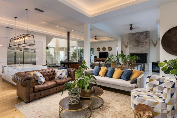 The main living area is an expansive open-plan space with high ceilings, abundant natural light and a luxurious sense of volume. Large windows frame the surrounding gardens, creating a serene connection to nature from every angle.
