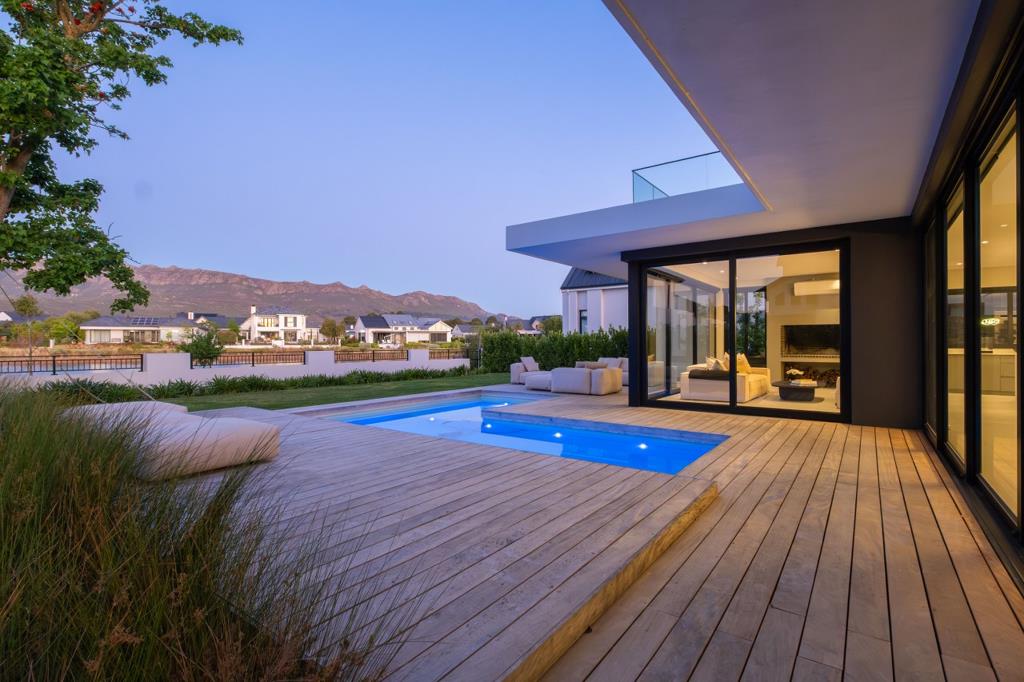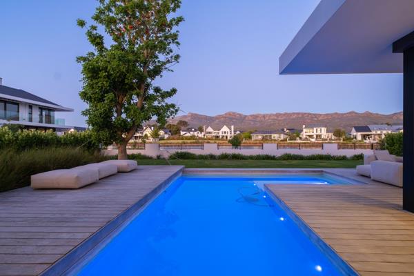 The ground floor welcomes you with expansive open-plan living spaces designed to maximize natural light and uninterrupted lake and mountain views. A gourmet kitchen, complete with separate scullery and laundry, flows seamlessly into the dining and lounge areas, where a feature fireplace/braai sets the tone for relaxed entertaining. A temperature-controlled wine cellar adds a luxurious touch, while large sliding doors lead out to a wooden deck, sparkling and heated swimming pool, and landscaped garden.