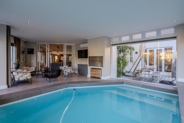 A highlight of this property is the indoor swimming pool, a serene retreat with ambient lighting and elegant stonework, offering year-round enjoyment in a private setting just steps from the heart of the home.