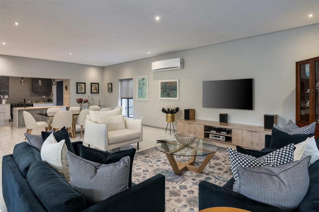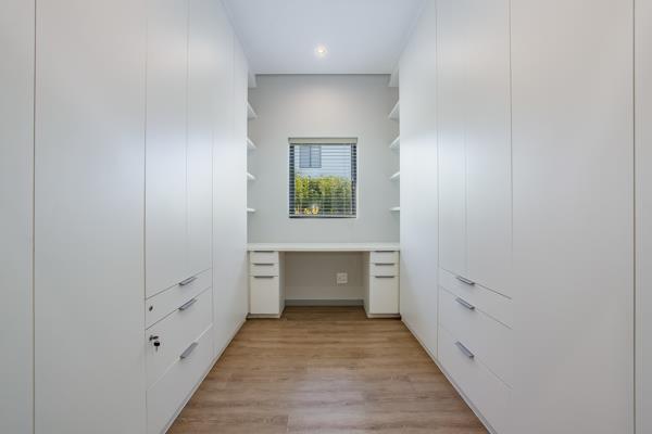 On entering the home through the spacious entrance passage you have this immediate feeling of its modern style. The open plan living area features a spacious lounge and dining area with gas fireplace and a gourmet kitchen with separate scullery. Leading of from the lounge while still being part of the open plan living area is the enclosed braai room with built in stainless steel gas braai and sliding doors leading out onto the pool deck and landscaped garden.