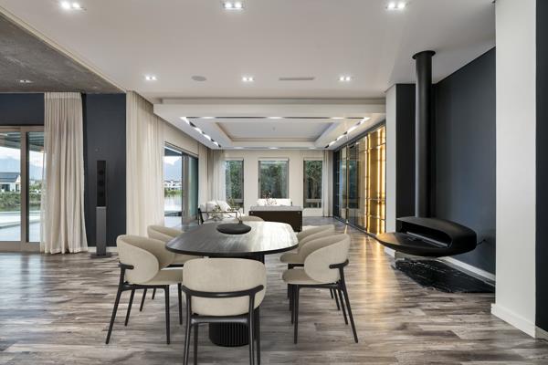 The residence features five sumptuous en-suite bedrooms, each a private retreat, along with a dedicated study, a plush cinema, a childrens playroom, and two sophisticated lounges. Expansive open-air terraces and dual entertainment spaces merge seamlessly with the outdoors, framing panoramic vistas of the iconic Simonsberg Mountain Range.