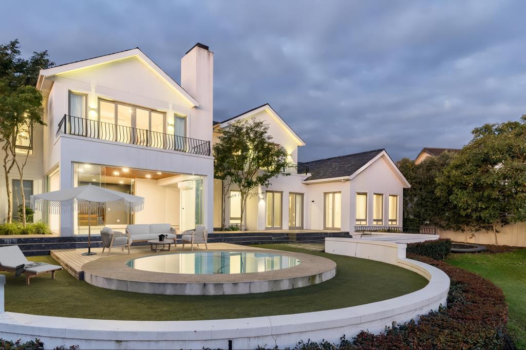 Outdoors, manicured gardens embrace a striking circular swimming pool, built-in braai, gas fireplace, and climate-controlled wine storage perfect for grand-scale entertaining or intimate gatherings.
