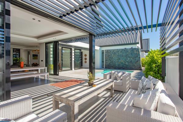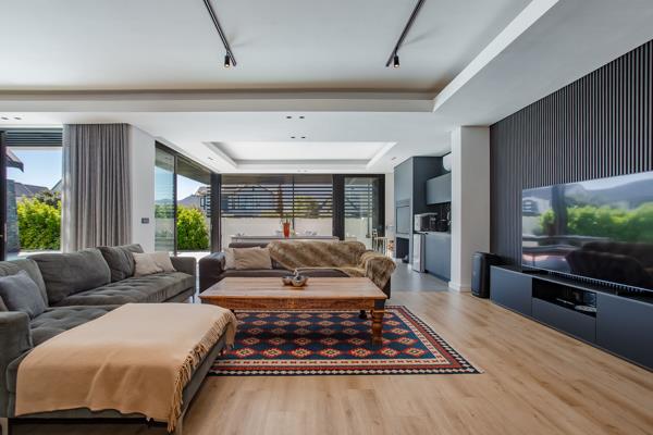 The home offers five bedrooms, including a luxurious main suite opening directly onto the garden, and a versatile fifth en-suite bedroom with separate access, ideal for guests or staff. A pajama lounge, dedicated study, and work nook provide flexible spaces for modern family life. With triple garaging, air-conditioning throughout, automated irrigation, and a full solar and battery backup system, this residence balances elegance, convenience, and sustainable living all set against the natural beauty of the Cape Winelands.
