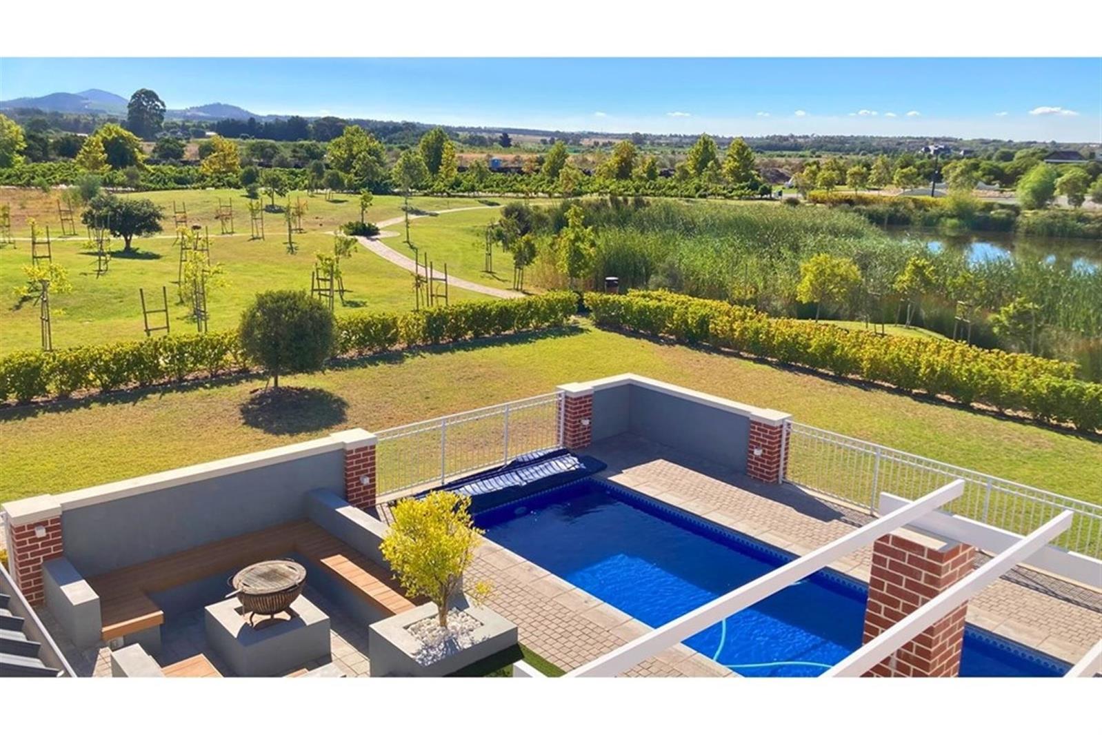 Perfectly positioned to capture panoramic views of a serene dam, vibrant greenbelt, and awe-inspiring mountain ranges, this property offers a lifestyle defined by comfort, elegance, and effortless family living. The design of this home exemplifies thoughtful, functional family living with meticulously crafted spaces. Enter through the grand foyer, where an elegant double staircase gracefully leads you to the upper level. Here, a spacious pyjama lounge and three generously sized en-suite bedrooms await, each tailored for both comfort and convenience. The master suite is a true retreat, featuring a private study or lounge, his and her dressing rooms, a lavish bathroom, and a cozy wood-burning fireplace.