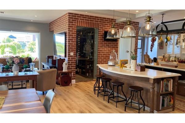 A wraparound balcony further enhances the peaceful ambiance, offering breathtaking views at every turn. The ground floor serves as both a sanctuary for everyday living and an entertainers dream. The Provincial Franais-style kitchen is the heart of the home, equipped with a large pantry and scullery, and adjoins a remarkable wine cellar that separates the kitchen from the open-plan dining and living areas. These spaces flow effortlessly into a natural light-drenched enclosed patio and a custom-designed bar, with a convenient serving hatch connecting to the outdoor entertainment area. The private garden is ideal for family gatherings, complete with a sparkling pool, built-in braai, and firepit area.