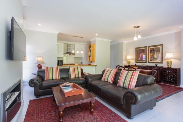 The open-plan living area includes a modern kitchen, dining space, and TV lounge with a cosy gas fireplaceideal for relaxed entertaining. The enclosed patio, fitted with elegant frameless stacking doors and a built-in braai, creates a seamless indoor-outdoor flow all year round. Featuring three bedrooms and two bathrooms (main en-suite), plus a double garage, this home delivers easy luxury and peace of mind within the sought-after Val de Vie Estate.
