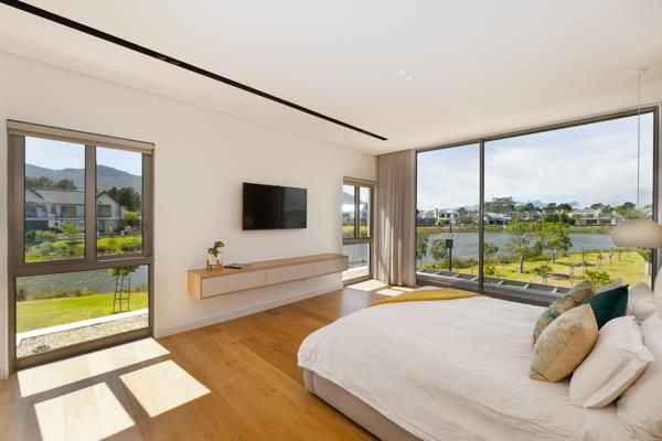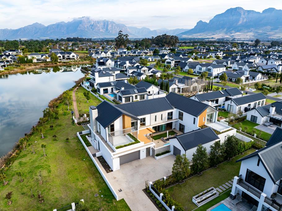 Situated in the prestigious Val de Vie Estate, this extraordinary five-bedroom en suite home captures the essence of luxury living, with panoramic lake and mountain views from nearly every angle. Floor-to-ceiling glass invites natural light throughout, seamlessly blending indoor elegance with the beauty of its serene surroundings.