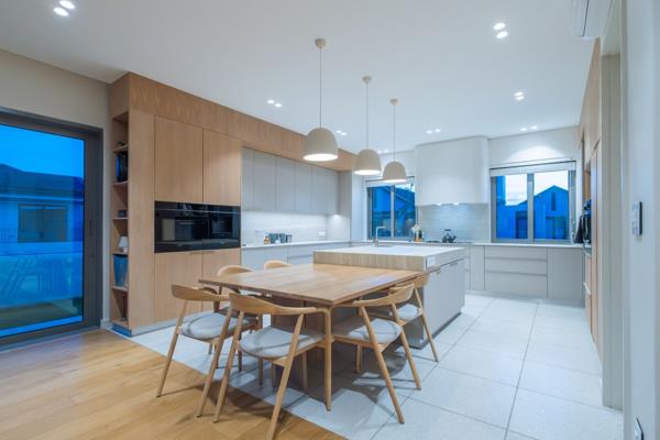 The open-plan layout flows seamlessly into a minimalist, clutter-free kitchen with a sleek eat-in counter, complemented by a separate scullery for functional convenience. The ground floor further offers the 5th and private en-suite guest bedroom and a beautifully appointed powder room. Sliding doors reveal a sun-drenched, north-facing courtyard complete with a swimming pool, jacuzzi, firepit, and custom outdoor cabinetry topped with screed countertops and a prep bowlan entertainers dream. A generous, separate playroom provides an additional lifestyle feature for families.