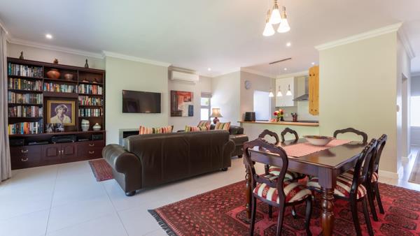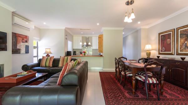 Beautifully maintained and positioned on a quiet street near the main gate, the property offers practical contemporary living with strong tenant appeal. The open-plan layout includes a modern kitchen, dining space and a TV lounge anchored by a gas fireplace. An enclosed patio with frameless stacking doors and a built-in braai extends the living and entertainment area, creating a seamless indoor-outdoor flow that works in every season.