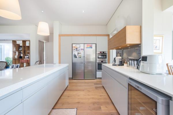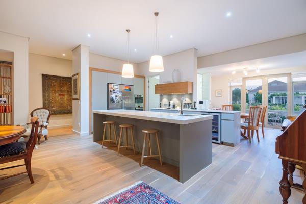 High ceilings and natural light enhance the homes spacious interiors, while wooden floors add warmth and sophistication. The open-plan living area comprising a lounge with fireplace, dining space, and a modern kitchen with a charming breakfast nook flows seamlessly to an enclosed braai room and outdoor garden.