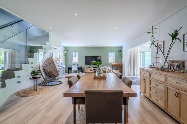The home offers generous open-plan living spaces that flow effortlessly from the kitchen into the dining and lounge areas. The layout allows for multiple living zones, whether a study nook, reading corner, or relaxed family lounge, while maintaining an open and connected feel. A contemporary staircase with glass balustrades adds a refined architectural feature.