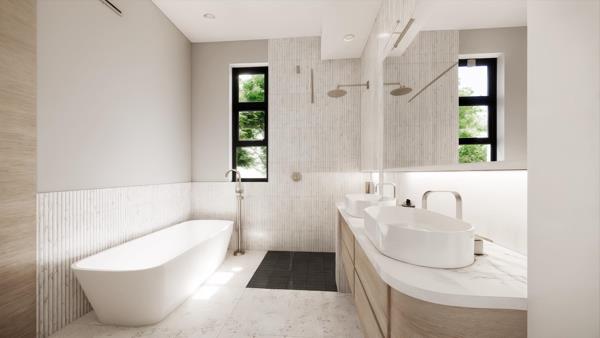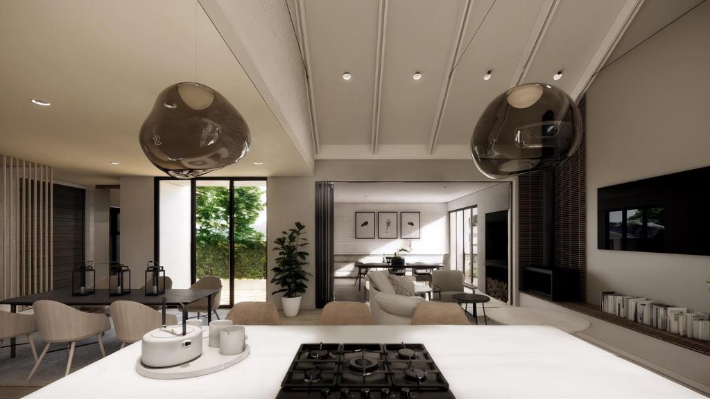 The home is thoughtfully configured for both everyday living and flexibility. Vertical privacy screens preserve views while enhancing discretion, and the double garage recesses neatly into the faade for a clean architectural finish. A ground-floor bedroom offers convenience for guests or multigenerational living, while tranquil upper-level bedroom suites with deep window reveals soften the sunlight and create calm, restful retreats.