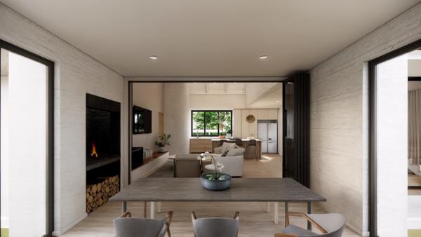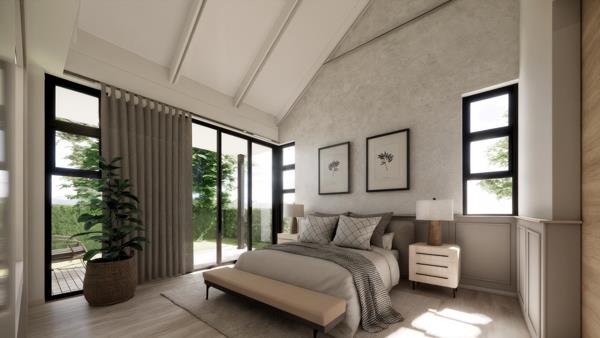 Designed for quiet luxury and effortless comfort, the residence presents a pure gable silhouette complemented by refined glazing, limewashed plaster, charcoal steel accents and hand-laid stone detailing that together create a timeless architectural expression. Full-height sliding doors invite soft Winelands light into the living spaces and open onto a sheltered courtyard ideal for slow breakfasts, relaxed afternoons and effortless evening entertaining.