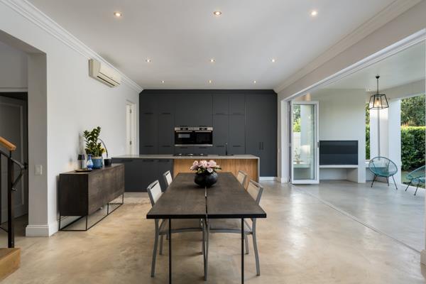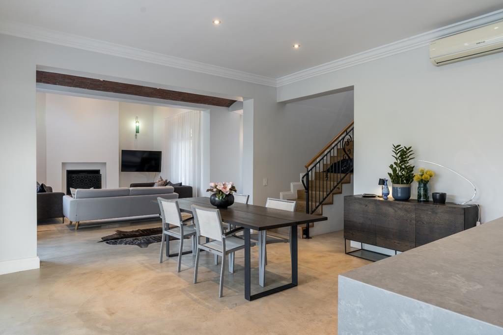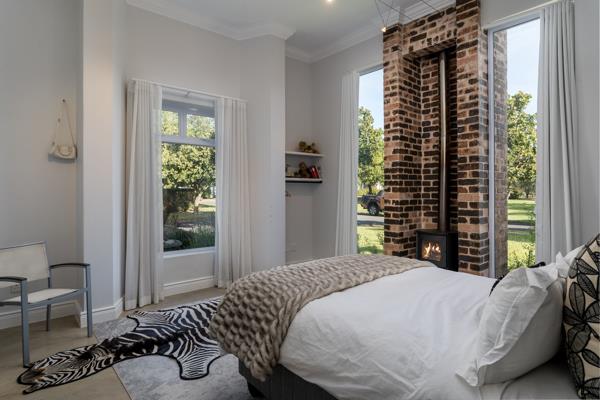 This elegant double-story home blends modern comfort with beautiful natural surroundings. Downstairs, a welcoming guest room offers both privacy and luxury, featuring a cozy wood-burning fireplace and a stylish en-suite bathroom. The open-plan living area is perfect for entertaining, as the kitchen and dining spaces flow seamlessly onto a spacious patio that overlooks a sparkling poola fantastic spot for enjoying warm, sunny days with beautiful mountain views as the backdrop.