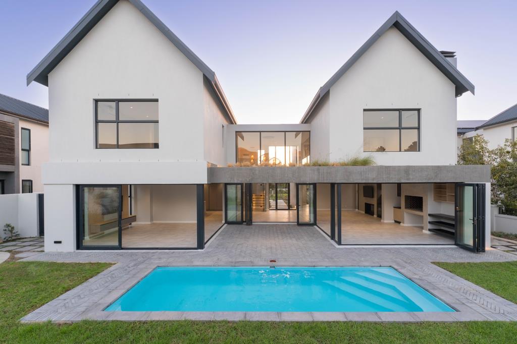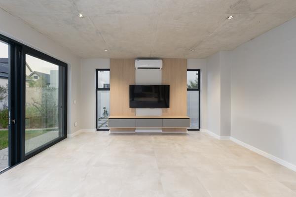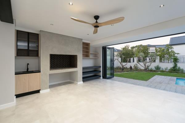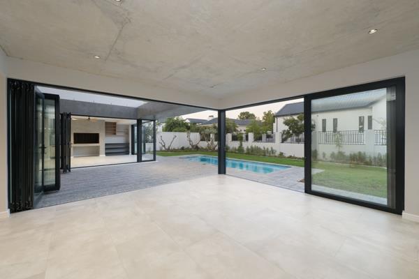 Sliding doors open to a well-designed braai area that overlooks the sparkling pool, offering an inviting indoor-outdoor flow. A separate, private family room with a glass door provides the option to close off the space for quiet time or movie nights.