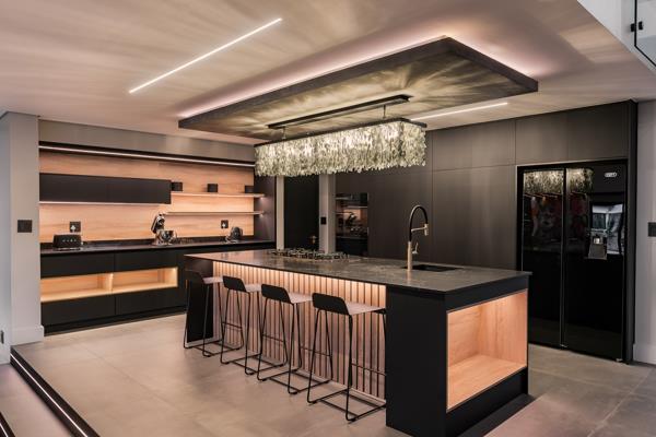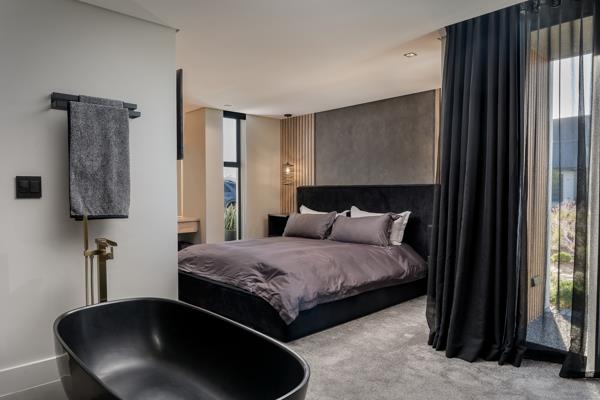The home is equipped with underfloor heating in all bedrooms, the kitchen, braai room, and main bathroom, ensuring year-round comfort. Air conditioning adds to the homes climate control, making it a perfect retreat no matter the season. Inside, luxury is evident in every detail, from the Steven Pikus chandeliers that illuminate the kitchen, stairwell, and master suite, to the custom-designed supamatt black cupboards with Luca Polenta interiors in the bedrooms. The kitchen, bar, and master bedroom all feature beautiful Caesarstone Vanilla Noir granite countertops, further enhancing the homes sophistication.