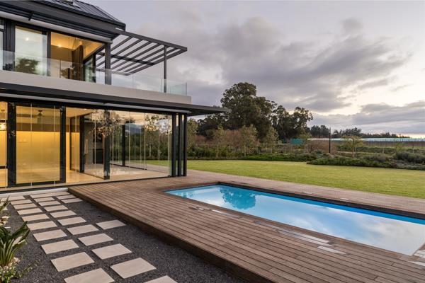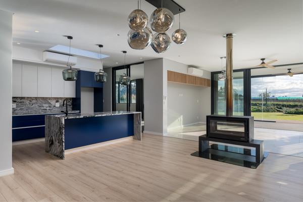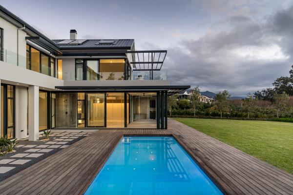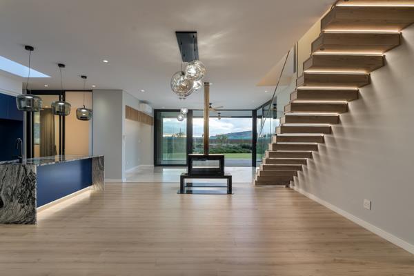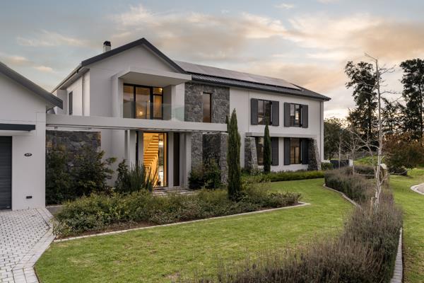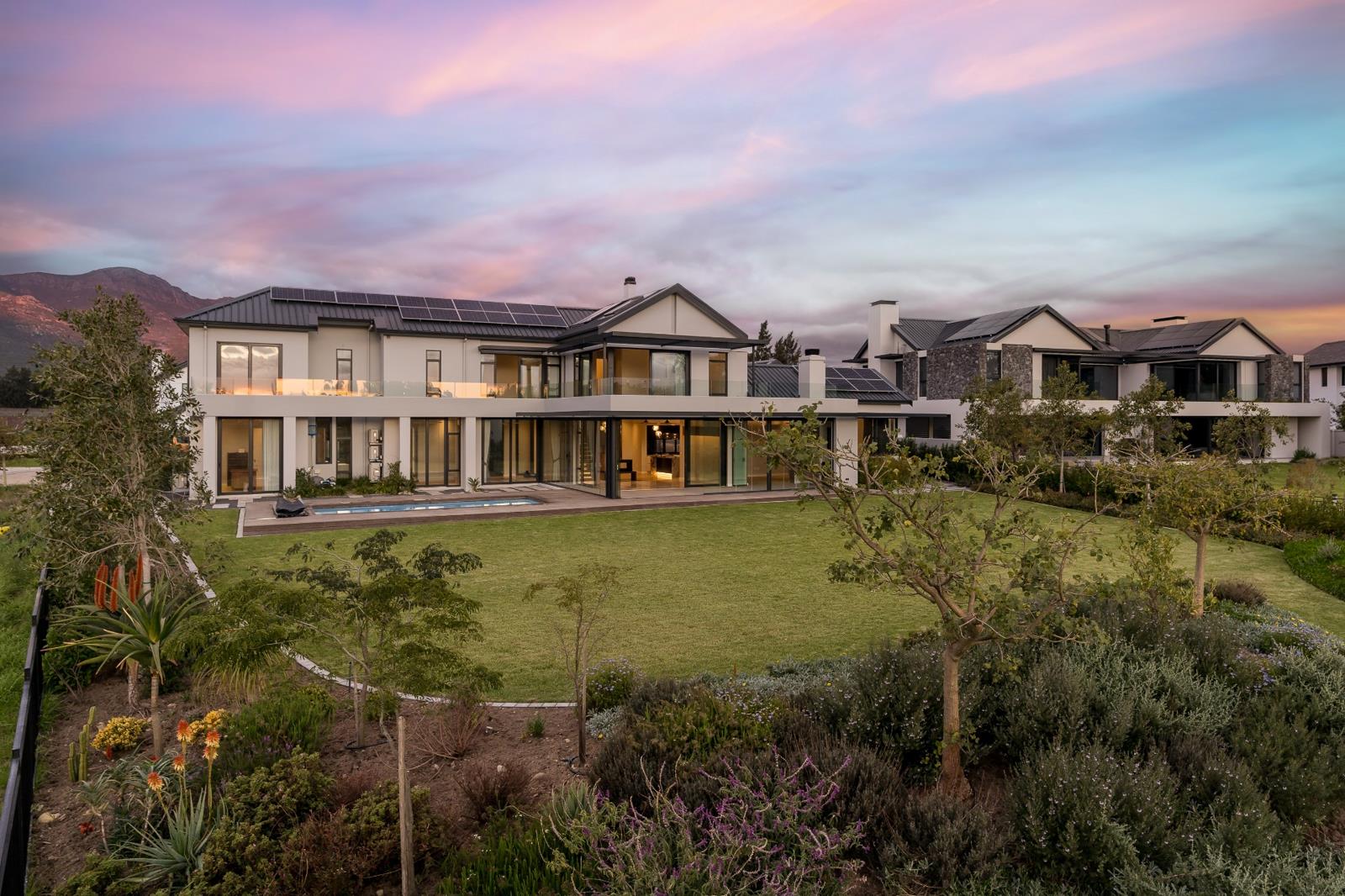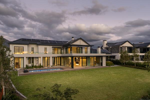 Situated in the prestigious River Farm area of Val de Vie Estate, this beautifully designed five-bedroom residence offers panoramic views of the Berg River, private vineyards and mountain rangesan ideal blend of natural beauty and sophisticated living.