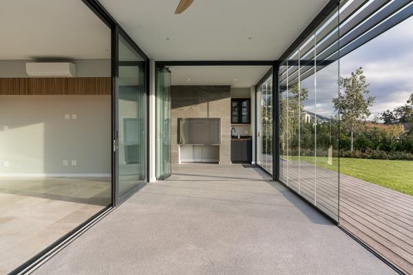 The layout is thoughtfully planned for both family life and entertaining. The open-concept living space features large glass doors that flood the interior with natural light and lead to a covered entertainment area complete with a built-in braai and bar. A stylish kitchen with a central island, walk-in pantry, and scullery caters to both everyday use and special gatherings. A sliding window brings fresh air and scenic garden views directly into the cooking space.