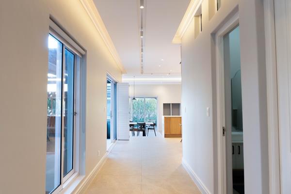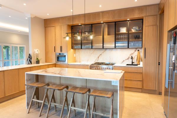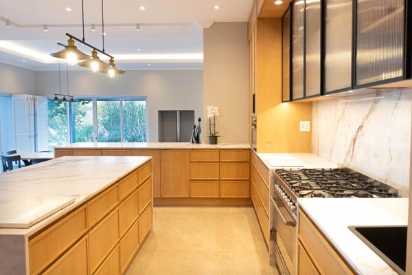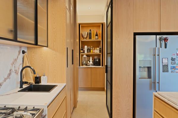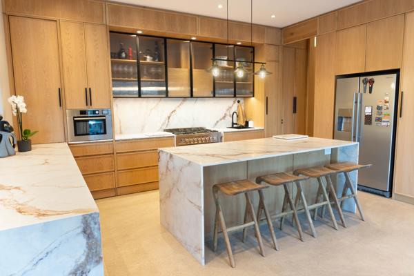 Sustainability and innovation are seamlessly integrated with a three-phase 12kW inverter solar system, 12 solar panels 6.8kWh and a 15kW battery powering the entire house including two 200L geysers, seven air-conditioning units, the pool and security systems. Solar, pool and security cameras are WiFi-enabled, as are the Daikin air-conditioning units in the kitchen, dining and TV areas.