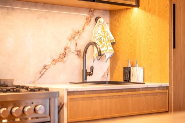 The designer kitchen is both functional and refined, featuring custom oak cabinetry with pocket doors and embedded LED lighting, 20mm quartz countertops and large-format Ceramica Sant Agostino Italian tiles extending through the kitchen, scullery and dining areas. Premium Ilve appliances include a 90cm six-burner gas cooker with electric oven and warmer drawer, as well as a 4-in-1 combi oven offering microwave, steam, convection and grill functionality. Franke sinks and Hansgrohe black taps complete the space, with soft-close drawers and cabinetry fitted throughout the home.
