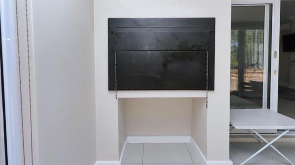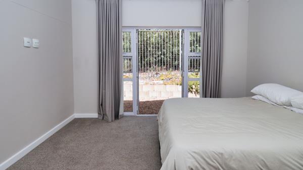 Stacking doors lead from the living area to an enclosed braai room, providing an additional versatile space that opens to the gravel garden area and the natural surroundings behind the home. The property offers three bedrooms with built-in cupboards and two bathrooms, with the main bedroom enjoying its own en-suite.