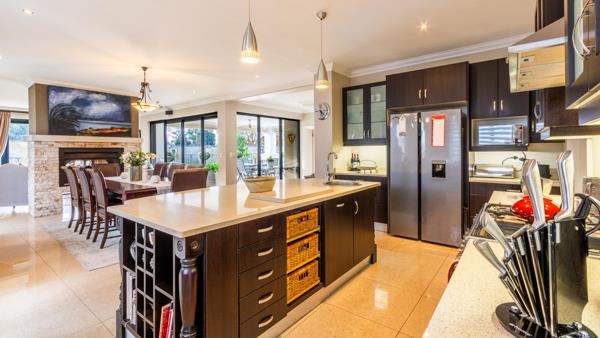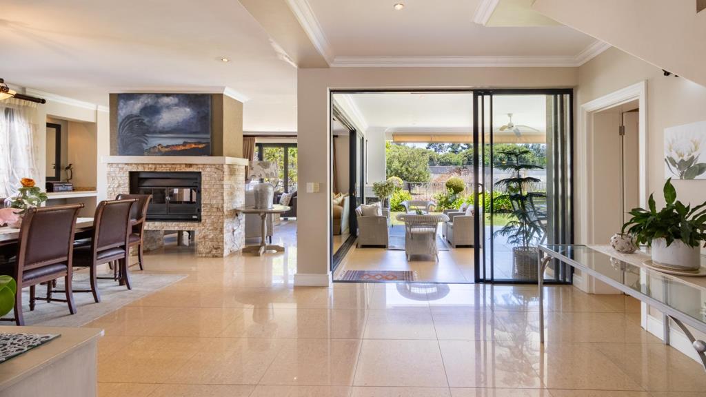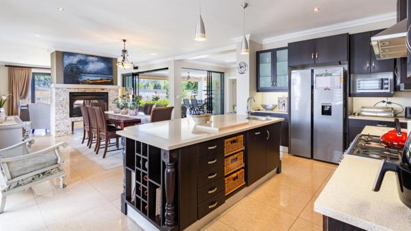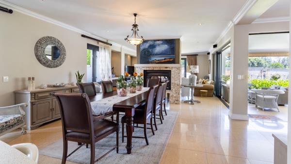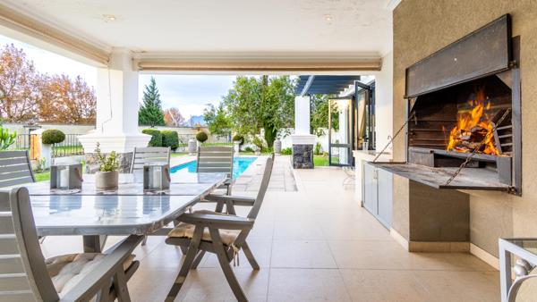 The gourmet kitchen boasts caesarstone countertops, a Smeg gas stove, pantry, with separate scullery, flowing effortlessly into the open-plan dining and TV lounge. A dual-sided fireplace adds warmth, while sliding doors lead to a covered entertainment patio with built-in braai overlooking the sparkling pool.