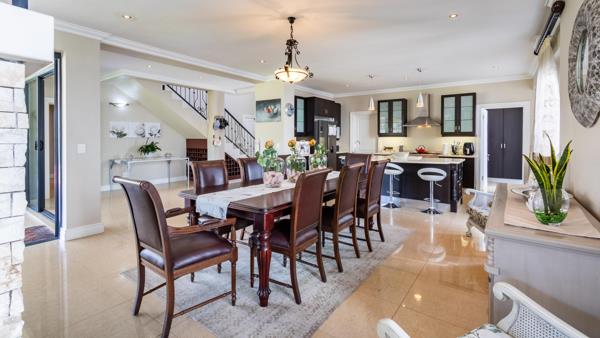 Designed for modern family living, the home features four spacious bedrooms. A sun-filled guest suite on the lower level opens directly onto the pool and manicured garden, while upstairs three elegant bedrooms enjoy private balconies with uninterrupted views of the Drakenstein Mountains. The spacious main suite is a tranquil retreat with a walk-in wardrobe with luxurious en-suite bathroom.