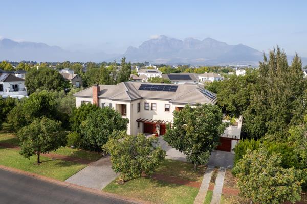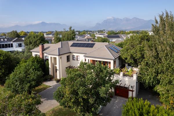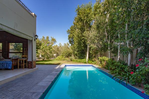 An elegant well-built home featuring open-concept living spaces and expansive windows that flood the home with natural light. The formal lounge boasts a generous fireplace and seamlessly flows into the main living area, which includes an open-plan kitchen and dining room ideal for entertaining family and friends. From here, step out onto a spacious undercover patio with built-in braai and enjoy the inviting swimming pool, all set amidst a lush, beautifully landscaped garden with a plethora of birdlife.