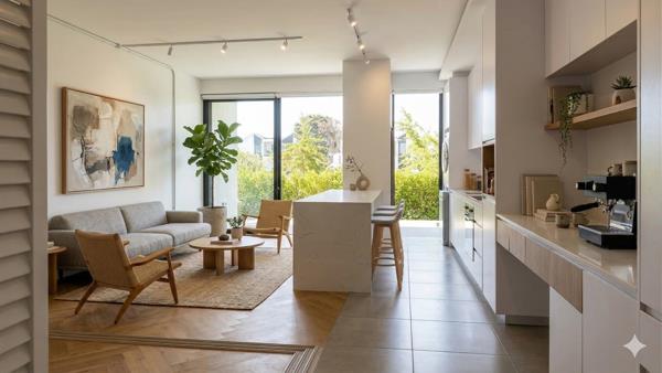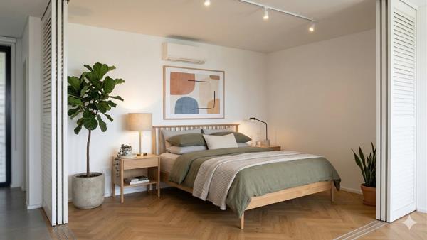 The versatile bedroom space can be enclosed with elegant shutter doors, offering privacy without compromising the apartments airy aesthetic. Every detail has been curated to reflect understated luxury and practical design.