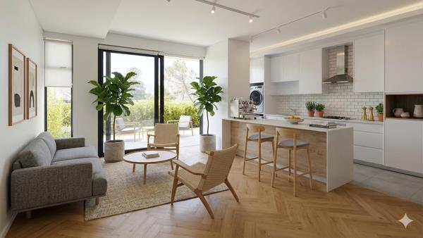 Bathed in natural light, the thoughtfully designed open-plan layout maximises space and flow, creating a sophisticated yet inviting atmosphere. The contemporary kitchen is fully equipped with premium integrated appliancesincluding a dishwasher, washer-dryer and fridge-freezer, while a sleek breakfast bar adds both style and functionality, ideal for effortless everyday living or entertaining.